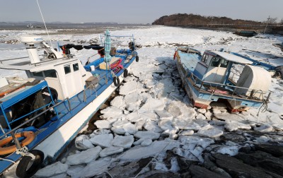 북극발 한파에 꽁꽁 얼어붙은 포구