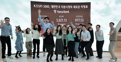 코스피 5021.13 축하하는 하나은행 딜링룸 직원들