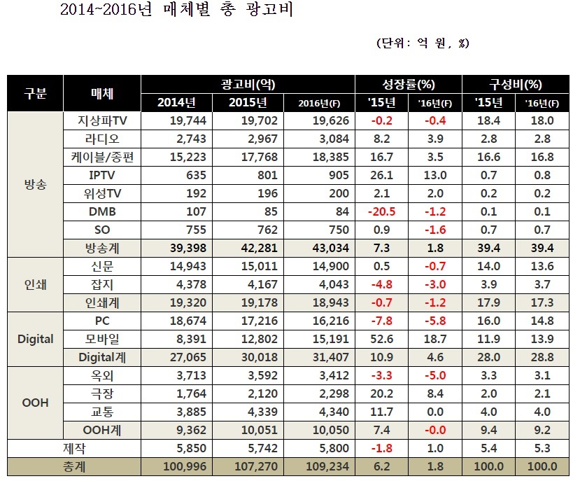 이와 함께 지난해 총 광고비는 2014년 10조996억원보다 6.2% 많은 10조7270억원을 기록했다고 밝혔다.