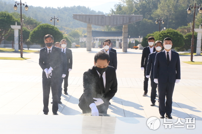 | 지난 7일 광주를 찾은 장성민 세계와 동북아 평화포럼 이사장이 지난 7일 5.18 민주 묘역을 찾아 분향하고 있다. [사진=조은정 기자] 2020.10.13 ej7648@newspim.com |
