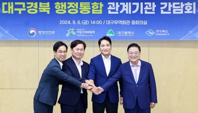 [대구·경북종합=뉴스핌] 남효선 기자 = 6일 오후 대구무역회관에서 열린 '대구경북행정통합 관계기관 회의'에서 대구시와 경북도, 행안부, 지방시대위원회가 "대구·경북 통합 논의 재개"를 공식 발표하고 손을 맞잡고 있다. 이날 간담회에서 4개 기관은 '대구·경북 통합의 기본 방향'에 따라 대구시와 경북도가 주도해 통합방안을 마련키로 뜻을 모으고 앞으로 약 한 달 동안 매주 실무 협의를 개최키로 합의했다. 또 통합자치단체의 종류와 광역-기초 간 관계 등 일부 사안에 대해서는 행안부와 지방시대위도 논의를 지원키로 했다. 사진 왼쪽부터 김민재 행정안전부 차관보, 김호진 경북도 기획조정실장, 황순조 대구시 기획조정실장, 우동기 지방시대위원장.[사진=경북도]2024.09.06 nulcheon@newspim.com