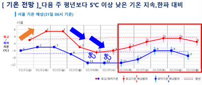 특히 아침 기온의 경우 한파특보가 발효된 경기북부와 강원내륙.산지, 충남중부내륙, 충북중.북부, 경북북부내륙, 북동산지를 중심으로 아침 기온이 -10도 내외, 그 밖의 지역에서는 -5도 내외로 낮겠다. 일부 강원내륙.산지, 경북북동산지는 -15도 내외로 떨어지겠다.
