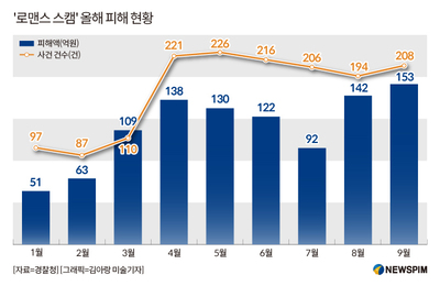 로맨스 스캠 범죄는 올해 1월부터 9월(가장 최근 데이터)까지 1566건이 신고됐고 피해액은 1000억원을 기록했다. 지난해 경찰청이 처음으로 통계를 집계한 지난해 2월부터 12월까지의 1265건, 675억원과 비교해 신고 건수와 피해 규모 모두 증가한 수치다.