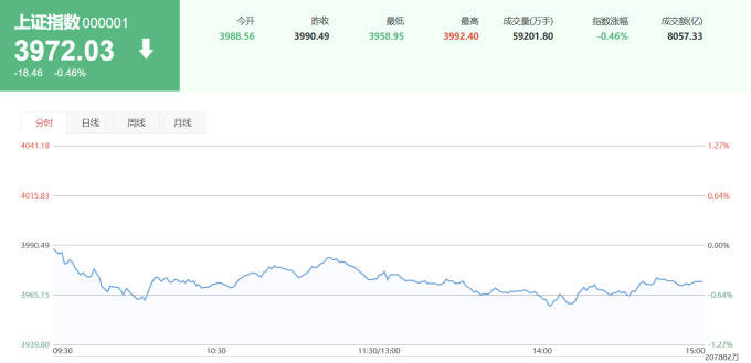 이날 상하이종합지수는 0.46% 하락한 3972.03, 선전성분지수는 0.11% 하락한 13202.00, 촹예반지수는 0.20% 하락한 3105.20으로 각각 장을 마감했다.