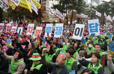 | [서울=뉴스핌] 양윤모 기자 =학교에서 급식과 돌봄을 담당하는 비정규직 노동자들이 20일 오후 서울 여의도 국회의사당 앞에서 총파업 대회를 열고 기본급 인상과 방학 중 비근무자 생계대책 마련 등을 촉구하고 있다. 파업 첫날 지역의 교육 당국은 학교별로 빵과 우유 등으로 대체 급식을 실시 했다. 2025.11.20 yym58@newspim.com |