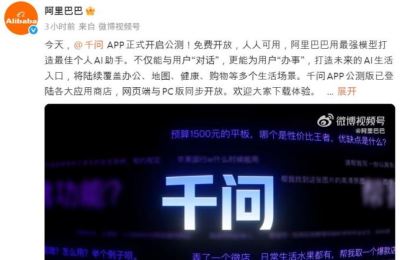 | [사진 = 알리바바 공식 웨이보 캡처] 중국 대표 빅테크 알리바바(9988.HK)는 지난 17일 공식 웨이보를 통해 인용해, 자체 개발한 개인용 인공지능(AI) 어시스턴트 첸원(千問∙Qwen) 앱(APP)의 공개 베타 테스트를 시작했다고 전했다. |