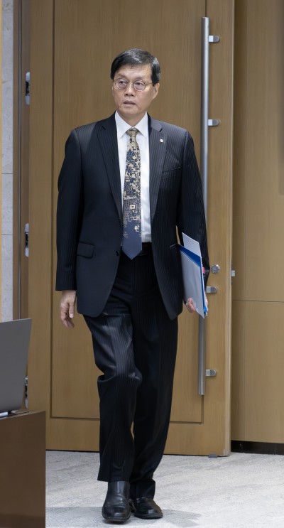 | [서울=뉴스핌] 양윤모 기자 = 이창용 한국은행 총재가 27일 오전 서울 중구 한국은행 본관에서 열린 올해 마지막 금융통화위원회 본회의에서 회의를 알리는 의사봉을 두드리고 있다. [공동취재] 2025.11.27 yym58@newspim.com |