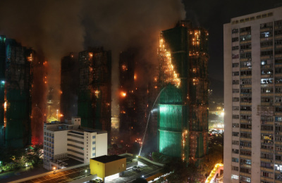 | 2025년 11월 26일 발생한 대형 화재로 홍콩 북부 타이포 구역에 있는 고층 아파트 단지 '웡 푹 코트(Wang Fuk Court)'의 8개 동 가운데 7개 동이 화마를 입었다. 사진은 화재 참사 이후인 11월27일 위성에서 내려다 본 아파트 단지 전경이다. 이번 화재로 11월28일 오전 8시 현재, 94명의 사망자가 발생했다. 실종자가 279명에 달하는 것으로 알려져 향후 사망자는 더 늘어날 것으로 우려됐다. |