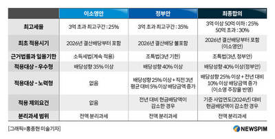 기존 정부안은 3억 원 초과 배당소득에 일률적으로 35% 세율을 적용하는 방식이었지만, 개정안은 최고세율을 25%로 낮추고 50억원 초과 구간을 신설하는 내용을 담았다.