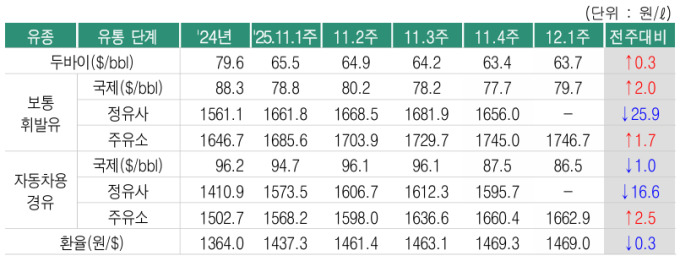 이번주 국제유가는 미국과 러시아 간 러시아-우크라이나 평화 협상 고착과 미국 연방준비제도(연준·Fed)의 12월 금리 인하에 대한 시장 기대 확대 등에 영향을 받아 상승했다.