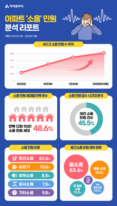 아파트 층간소음 문제는 꾸준히 발생하고 있다. 한국환경공단 층간소음 이웃사이센터 통계자료에 따르면 전화상담 서비스 접수 건수는 2015년 약 1만9000건에서 2021년 약 4만6000건까지 증가했다. 이후 감소 추세지만 지난해에는 약 3만3000건이 접수됐다.