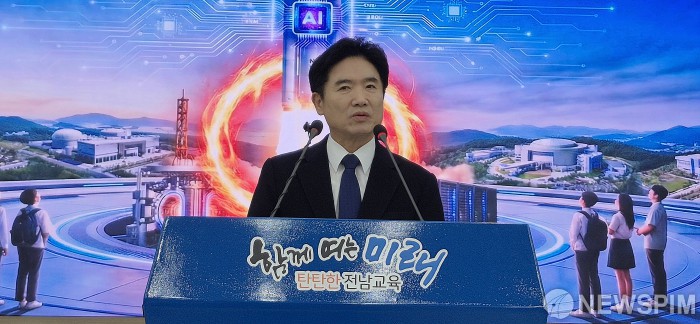 [무안=뉴스핌] 조은정 기자 = 김대중 전남도교육감이 9일 오후 교육청 대회의실에서 'AI전남교육정잭 비전 발표' 기자회견을 하고 있다. 2025.12.09 ej7648@newspim.com