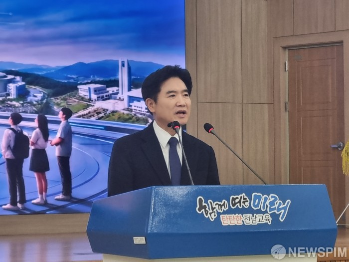 [무안=뉴스핌] 조은정 기자 = 김대중 전남도교육감이 9일 오후 교육청 대회의실에서 'AI전남교육정잭 비전 발표' 기자회견을 하고 있다. 2025.12.09 ej7648@newspim.com