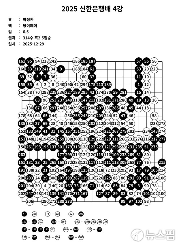 이날 팽팽한 백중세을 이루던 국면은 좌변 패를 둘러싼 공방에서 박정환 9단(흑)이 포인트를 따내며 우위를 점했다. 이후 당이페이 9단(백)의 버티기에도 박정환 9단이 흔들리지 않고 두텁게 국면을 마무리했다.