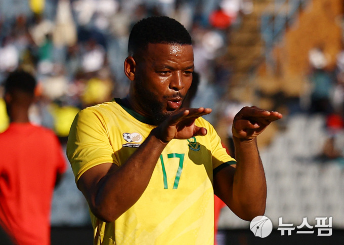 | [요하네스버그 로이터=뉴스핌] 남아공의 시포 음불레가 가나와의 친선 경기에서 골을 넣은 뒤 세리머니 하고 있다. 2025.12.16 wcn05002@newspim.com |