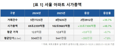 6일 부동산 정보업체 '부동산R114'에 따르면 지난해 서울 아파트 매매 시가총액(12월25일 기준)은 약 1832조원으로 집게됐다. 2024년(12월 24일 기준) 약 1624조4000억원과 비교하면 12.8%(약 207조9000억원) 늘었다.