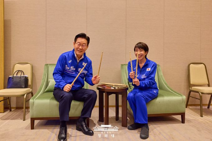 | 이재명 대통령과 다카이치 사나에 일본 총리가 13일 오후 일본 나라현에서 열린 한일 정상회담 후 친교 시간에 다카이치 총리가 좋아하는 드럼을 함께 치며 친밀한 한일 관계를 상징하는 즉석 드럼 합주를 선보였다. 한일 정상이 드럼 스틱을 들고 기념사진을 찍고 있다. [사진=청와대] |