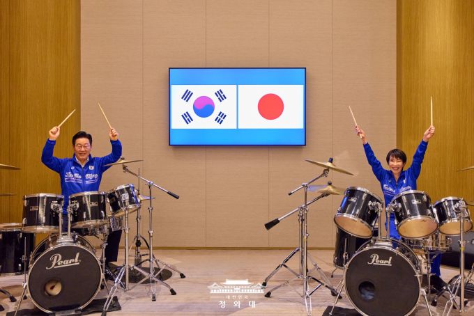 김남준 청와대 대변인은 이날 오후 브리핑을 통해 "환담 자리에서 양 정상은 일본 측이 마련한 푸른색 유니폼을 함께 착용하고 일본의 대표적인 악기 브랜드인 '펄' 드럼 앞에 나란히 앉아 즉석 드럼 합주를 선보였다"고 밝혔다.