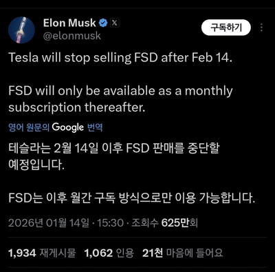 NHTSA은 지난해 10월 예비 평가를 시작했으며, 12월에는 테슬라에 소비자 불만, 현장 보고서, 사고 기록, 소송 자료, 내부 평가 등 FSD 관련 위반 의혹과 연관된 광범위한 자료 제출을 요구했다.