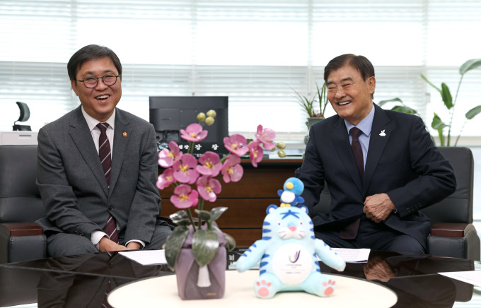 | [서울=뉴스핌] 김용석 기자 = 최휘영 문화체육관광부 장관이 19일 세종시 2027 충청 유니버시아드대회 조직위원회를 방문해 강창희 조직위원장과 면담을 하고 있다.[사진= 문체부] 2026.01.19 fineview@newspim.com |