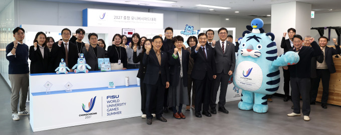 | [서울=뉴스핌] 김용석 기자 = 최휘영 문화체육관광부 장관이 19일 세종시 2027 충청 유니버시아드대회 조직위원회를 방문해 강창희 조직위원장을 비롯한 조직위 직원들과 함께 기념촬영을 하고 있다.[사진= 문체부] 2026.01.19 fineview@newspim.com |
