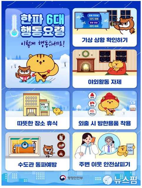또한 한파쉼터 운영 실태를 점검하고, 이동노동자 등에게 쉼터 이용 정보를 적극 안내할 예정이다. 농수산물 냉해 예방, 수도관 동파 방지, 전력수급 상황 관리 등 생활 불편을 최소화하기 위한 조치도 병행된다.