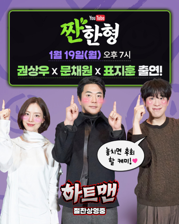 [서울=뉴스핌] 정태이 기자 = 2026년 새해 극장가에 기분 좋은 에너지를 전할 첫 코미디 영화 '하트맨'의 주역 권상우, 문채원, 표지훈이 유튜브 '짠한형 신동엽'에 출연해 신동엽과 웃음 넘치는 토크를 선보인다.