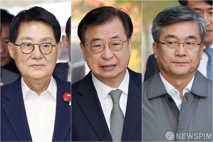 | [서울=뉴스핌] 정일구 기자 = 2020년 서해 공무원 피격 사건 은폐 혐의로 기소된 박지원 전 국가정보원장(왼쪽부터), 서훈 전 청와대 국가안보실장, 서욱 전 국방부 장관. [사진=뉴스핌DB] |