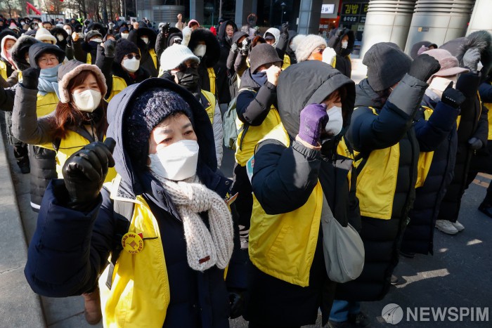 [서울=뉴스핌] 류기찬 기자 = 민주노총 서비스연맹이 21일 오전 서울 종로구 MBK 파트너스 사무실 앞에서 'MBK규탄 마트노조 홈플러스지부 간부 결의대회'를 열고 구호를 외치고 있다. 2026.01.21 ryuchan0925@newspim.com