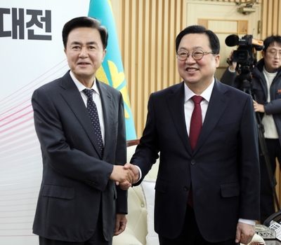 [대전=뉴스핌] 오종원 기자 = 이장우 대전시장(오른쪽)과 김태흠 충남지사가 21일 오전 대전시청 응접실에서 대전-충남 행정통합 관련 긴급 회동에 나섰다. 이 자리에서 이장우 시장은 여당인 더불어민주당 대전 지역 국회의원들이 행정통합에 대한 명확한 기준없이 정부안을 따르고 있다고 강하게 비판했다. 이 시장은 "대전 국회의원들이 그저 정부 행정통합안에 대해 종속적인 모습을 보이고 있는데 과역 지역을 사랑하는 분들인가 의심이 될 수준"이라며 "지방분권에 대한 기본 철학이나 고민 자체를 안하고 있다"며 보다 주체적인 태도를 촉구했다. jongwon3454@newspim.com