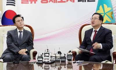 | [대전=뉴스핌] 오종원 기자 = 이장우 대전시장과 김태흠 충남지사가 21일 오전 대전시청 응접실에서 대전·충남 행정통합과 관련한 긴급 회동을 진행하고 있다. 2026.01.21 jongown3454@newspim.com |