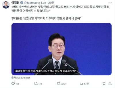 이 대통령은 전날 밤 엑스(X·옛 트위터)에 '팔면서 내는 세금보다 들고 버티는 세금이 더 비싸도 그렇게 할 수 있을까요'라는 4번째 글을 올렸다. 이 대통령이 이날 올린 6건의 X 글 중, 네 번째 다주택자 양도세 관련 내용이었다.