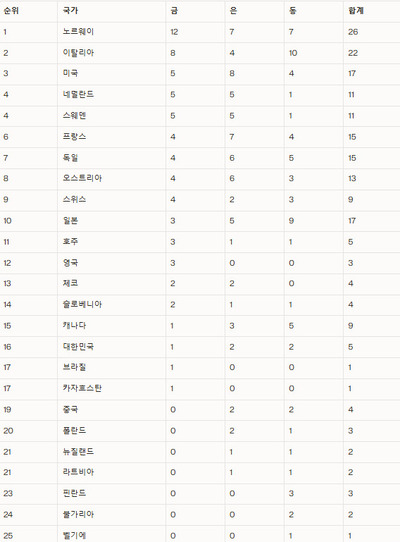 노르웨이는 금 14개, 은 8개, 동 8개로 금메달은 물론 메달 합계에서도 1위를 질주하고 있다. 개최국 이탈리아가 금 9개, 은 4개, 동 11개로 2위를 굳혀가고 있다. 미국이 금 6개, 은 10개, 동 5개로 3위에 자리했다.