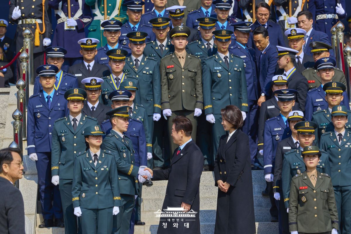 이 대통령은 "오늘날 우리가 마주한 안보 현실은 매우 엄중하다"며 "각자도생·약육강식이 바로 목도하고 있는 냉엄한 국제질서의 현실이다. 이러한 격변기에 신임 장교의 눈은 세계를 향해 있어야 한다"고 주문했다.