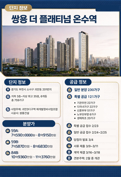 쌍용 더 플래티넘 온수역은 오는 23일 특별공급을 시작으로 24일 1순위, 25일 2순위 청약 접수를 진행한다. 당첨자 발표는 3월 4일이며, 정당계약은 3월 16일부터 18일까지다.