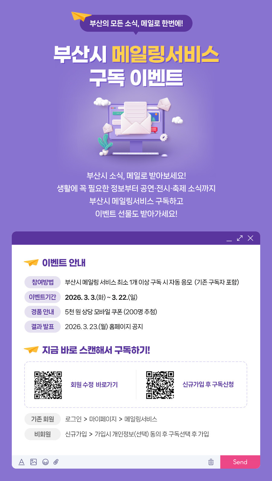 시는 누리집 기존 회원과 신규 회원을 대상으로 행사를 진행한다. 기존 회원은 로그인 후 마이페이지 메일링 서비스에서 1개 이상 구독하면 자동 응모되고, 비회원은 회원가입 시 개인정보 동의와 함께 신청하면 참여한다.