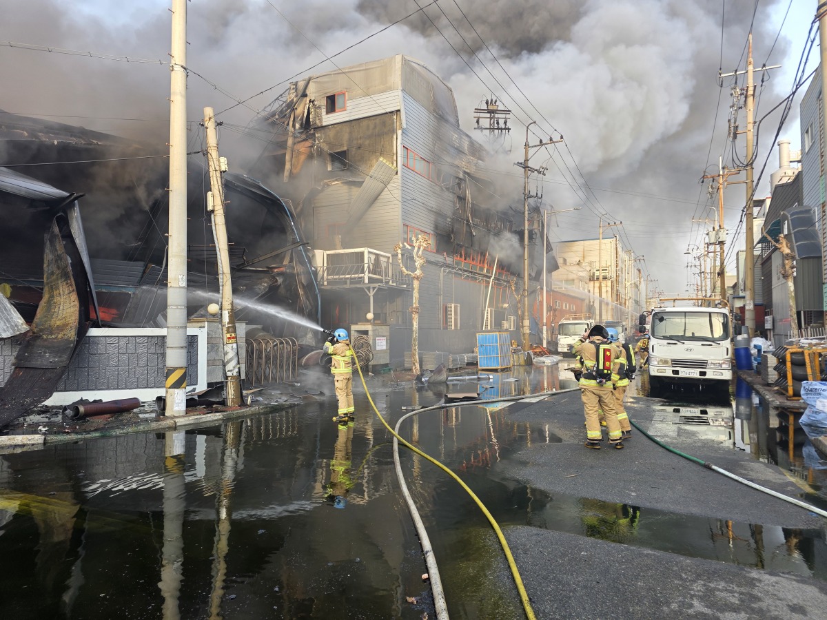 불은 인접 귀금속 가공공장으로 번지며 피해가 확산됐고, 12시간 여만인 23일 오전 2시25분께 완전히 꺼졌다.