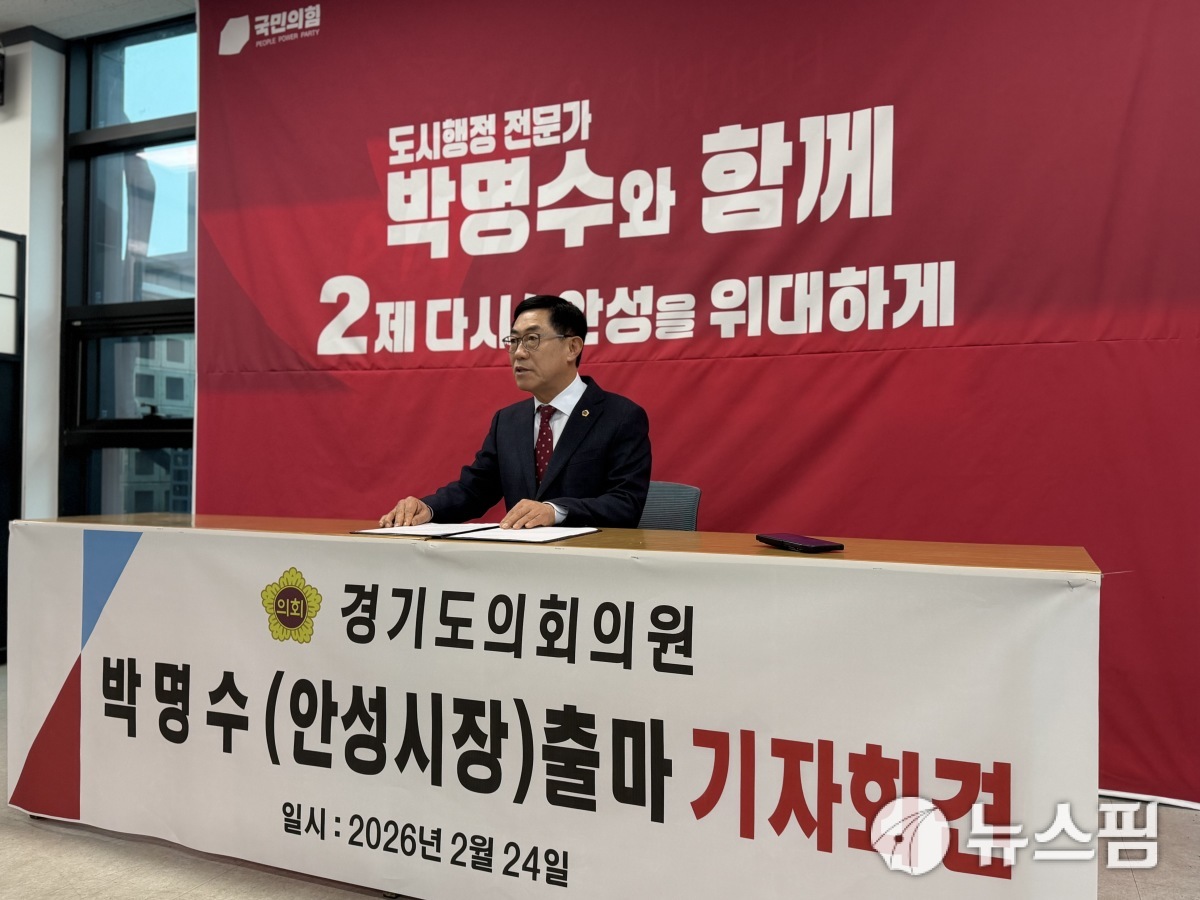 [안성=뉴스핌] 이석구 기자 = 국민의힘 박명수 경기도의원이 24일 당사에서 기자회견을 열고 제9회 전국동시지방선거 안성시장 출마를 공식 선언했다.