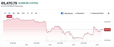 비트코인(BTC)은 25일 6만9000달러 부근까지 치솟으며 전날 저점 대비 10% 이상 반등했다. 이어 26일에는 6만8000달러 수준으로 후퇴했으며, 한국 시간 오후 7시 10분 현재는 24시간 전에 비해 4.7% 오른 6만8578달러에 거래되고 있다. 장중 고점과 저점 사이 변동폭은 약 5%에 달했다. 2월 5일 급락 이후 7만달러선을 재탈환하려는 가장 강력한 시도였지만, 명확한 돌파에는 이르지 못했다.
