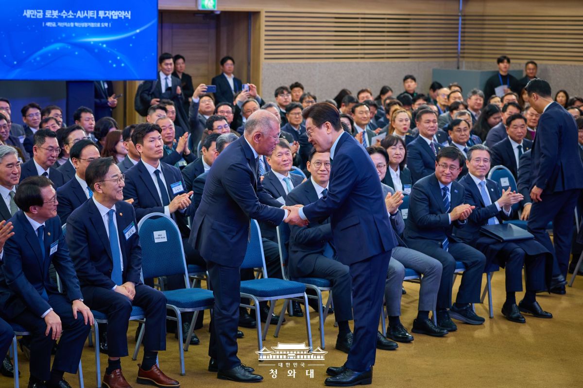 이 대통령은 "국가와 국민이 함께 키워낸 현대자동차그룹이 새만금에 대대적 투자를 시작한다"며 "큰 결단을 내린 정의선 회장님과 임직원 여러분께 감사드린다. 기업의 과감한 결단에 정부는 더 과감한 지원으로 화답하겠다"고 말했다.