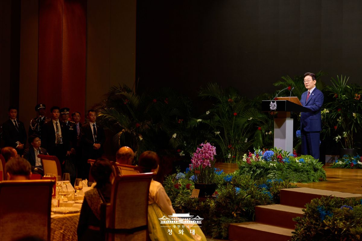 이 대통령은 이날 저녁 싱가포르 카펠라 호텔에서 열린 국빈 만찬에서 이같이 말했다. 이 대통령은 "과거 해운과 무역, 금융을 통해 세계를 연결했던 싱가포르와 자유 무역과 글로벌 공급망 속에서 성장해 온 우리 대한민국이 이제는 디지털 연결성과 기술 혁신을 통한 새로운 번영의 길에서 서로를 필요로 하고 있다"며 강조했다.