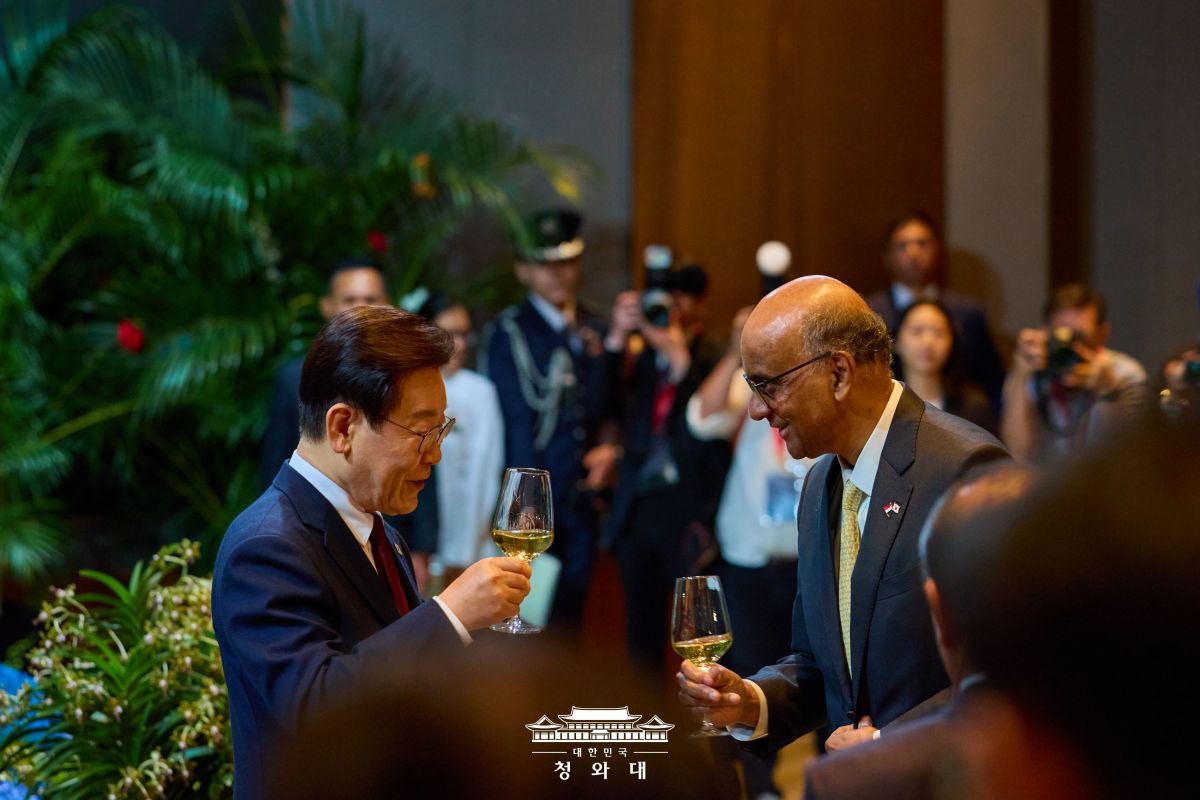 [싱가포르=뉴스핌] 박찬제 기자 = 이재명 대통령이 2일(현지시간) 타르만 샨무가라트남 대통령 부부와의 국빈 만찬 에서 "시대적 과제 앞에서 양국이 미래를 선도하는 혁신 강국이자 책임 있는 중견국으로서 혁신적이고 개방적이며 포용적인 국제질서를 함께 지켜 나가기를 바란다"고 밝혔다.