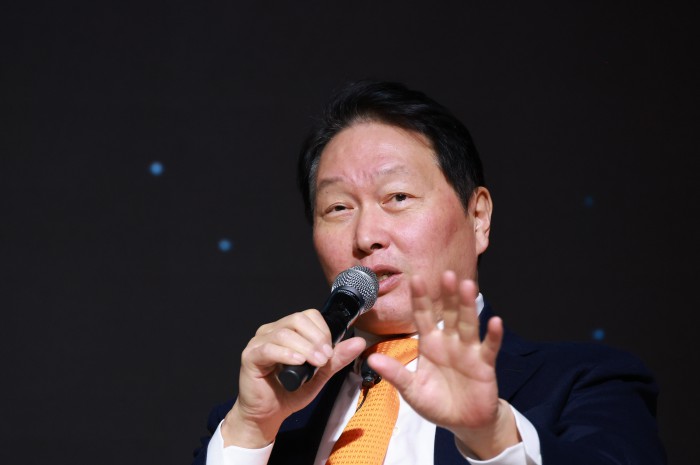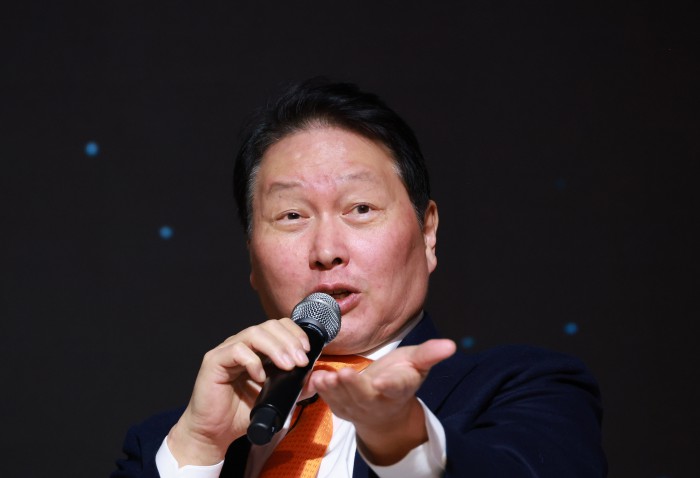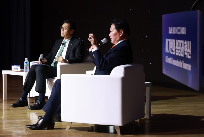 [서울=뉴스핌] 김학선 기자 = 최태원 대한상공회의소 회장이 5일 서울 중구 대한상의 국제회의장에서 열린 제4회 BOK-KCCI 세미나에서 이창용 한국은행 총재와 특별대담을 하고 있다. 2025.12.05 yooksa@newspim.com