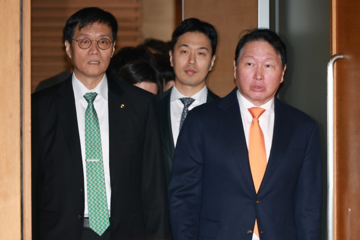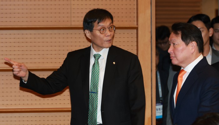 [서울=뉴스핌] 김학선 기자 = 이창용 한국은행 총재와 최태원 대한상공회의소 회장이 5일 서울 중구 대한상의 국제회의장에서 열린 제4회 BOK-KCCI 세미나에 참석하고 있다. 2025.12.05 yooksa@newspim.com