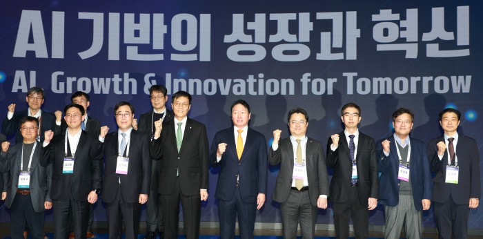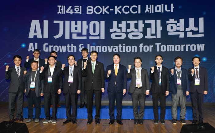 [서울=뉴스핌] 김학선 기자 = 이창용 한국은행 총재와 최태원 대한상공회의소 회장, 이홍락 LG AI연구원장 등 참석자들이 5일 서울 중구 대한상의 국제회의장에서 열린 제4회 BOK-KCCI 세미나에서 기념촬영을 하고 있다. 2025.12.05 yooksa@newspim.com