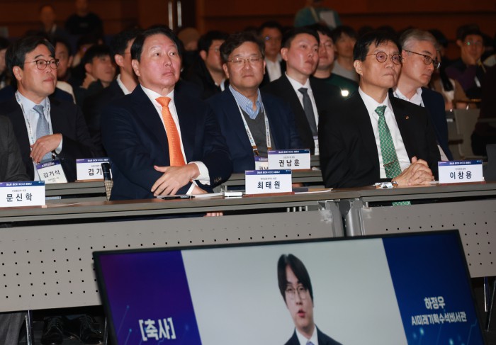 [서울=뉴스핌] 김학선 기자 = 이창용 한국은행 총재와 최태원 대한상공회의소 회장이 5일 서울 중구 대한상의 국제회의장에서 열린 제4회 BOK-KCCI 세미나에 참석해 하정우 대통령실 AI미래기획수석비서관의 영상축사를 듣고 있다. 2025.12.05 yooksa@newspim.com