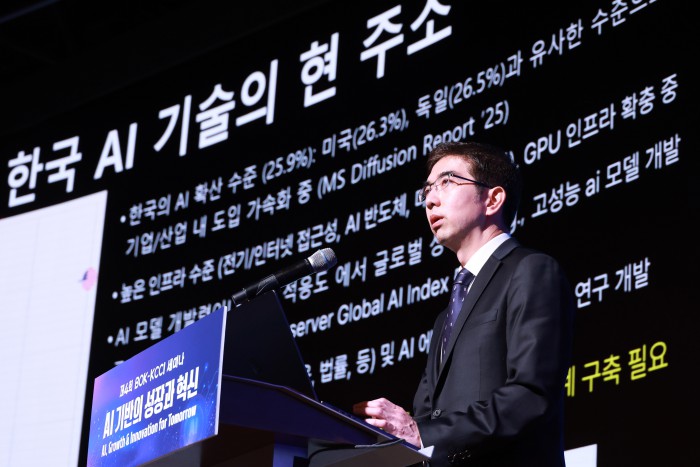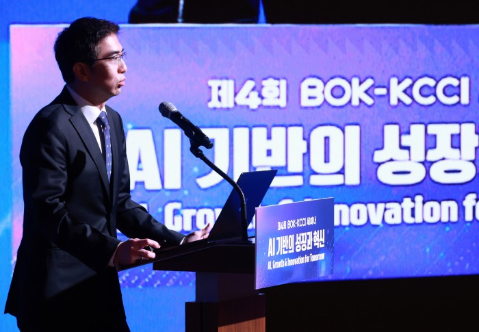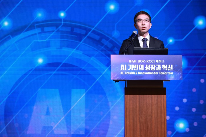 [서울=뉴스핌] 김학선 기자 = 이홍락 LG AI연구원장이 5일 서울 중구 대한상의 국제회의장에서 열린 제4회 BOK-KCCI 세미나에서 기조강연을 하고 있다. 2025.12.05 yooksa@newspim.com