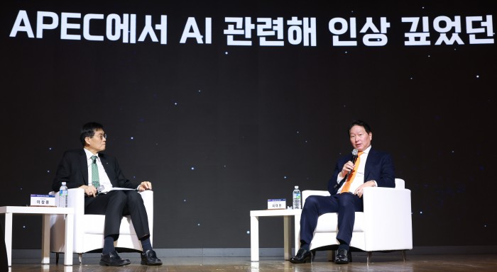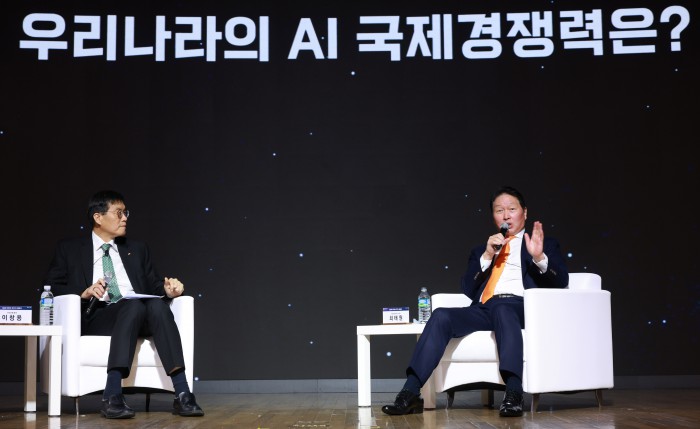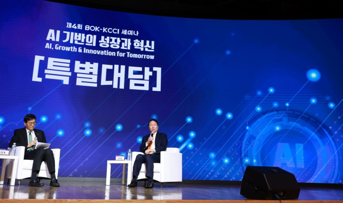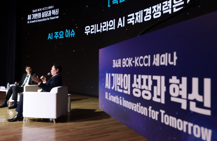 [서울=뉴스핌] 김학선 기자 = 최태원 대한상공회의소 회장과 이창용 한국은행 총재가 5일 서울 중구 대한상의 국제회의장에서 열린 제4회 BOK-KCCI 세미나에서 AI 관련 특별대담을 하고 있다. 2025.12.05 yooksa@newspim.com