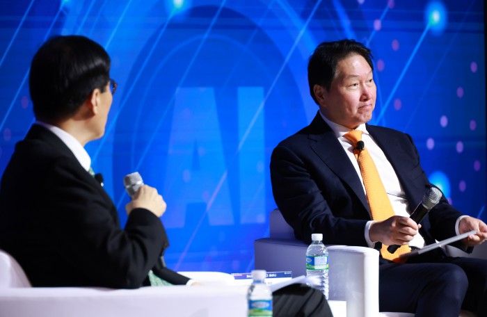 [서울=뉴스핌] 김학선 기자 = 최태원 대한상공회의소 회장이 5일 서울 중구 대한상의 국제회의장에서 열린 제4회 BOK-KCCI 세미나에서 이창용 한국은행 총재와 AI 관련 특별대담을 하고 있다. 2025.12.05 yooksa@newspim.com