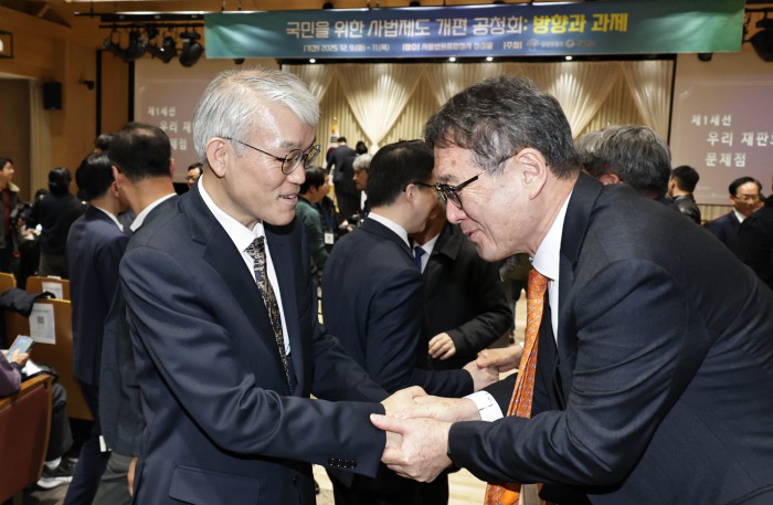 [서울=뉴스핌] 양윤모 기자 = 천대엽 법원행정처장이 9일 서울 서초구 서울법원종합청사 청심홀에서 열린 '국민을 위한 사법제도 개편' 공청회 개회식을 마치고 참석자들과 악수하고 있다. 최근 국회에서 사법개혁 논의가 활발하게 진행되고 있는 가운데, 사법부가 공론의 장을 마련해 주권자인 국민의 입장에서 필요하고 바람직한 사법제도 개편 방향에 대해 법조계, 학계, 언론계 및 시민사회단체 등 다양한 분야 전문가들의 의견을 청취하고자 11일까지 진행한다. 2025.12.09 yym58@newspim.com
